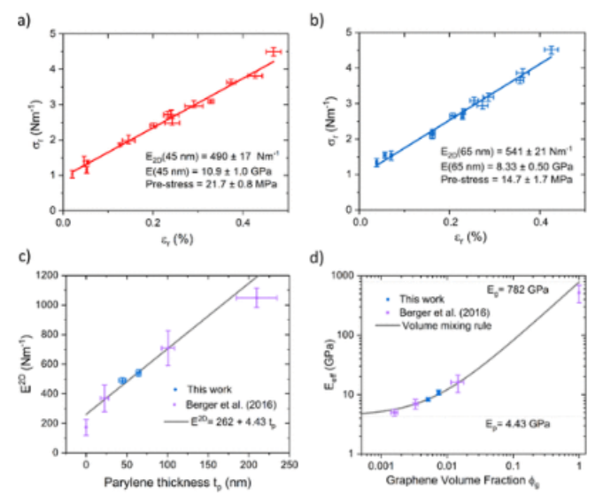 2D與聚對二甲苯厚度,。對于本工作中的數據,y誤差條來自(a,b)的線性回歸中的不確定性。x誤差條是七個厚度測量值的標準偏差。(d)GPH膜的有效體積模量是石墨烯體積分數的函數,符合體積混合規則。兩條水平虛線表示提取的石墨烯和聚對二甲苯的體積模量。通過組合(a,b)的線性回歸中的誤差和膜厚度的不確定度來量化誤差條。Berger等人(2016)的數據誤差條通過結合所述E2D和膜厚度不確定度中的所述不確定度進行量化。