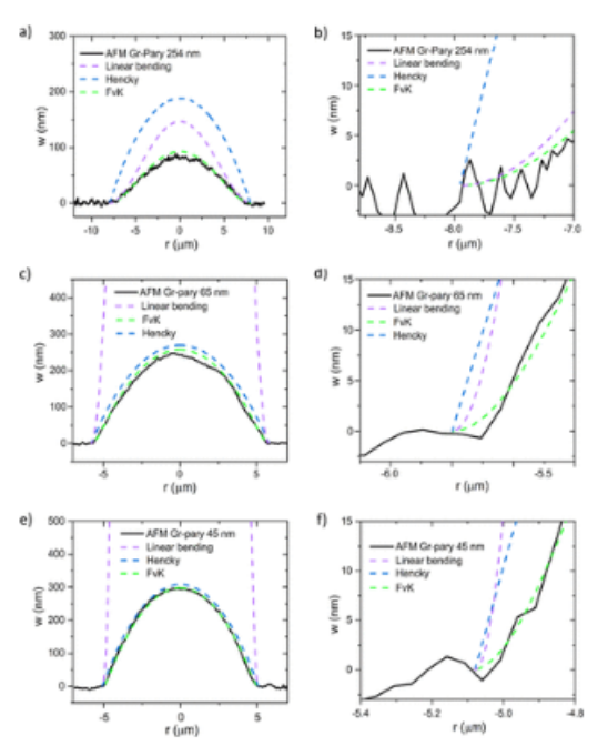 圖4. 與線性彎曲、Hencky解和FvK模型相比,GPH膜相對于徑向位置的偏轉。(a) 254 nm的膜厚加壓至ΔP=21 kPa。(b) 夾緊膜邊緣周圍(a)的放大。(c) 65 nm的厚度加壓至ΔP=68 kPa。(d) 夾緊膜邊緣周圍(b)的放大。(e) 加壓至ΔP=116 kPa的45 nm厚度。(f) 夾緊膜邊緣周圍(e)的放大。