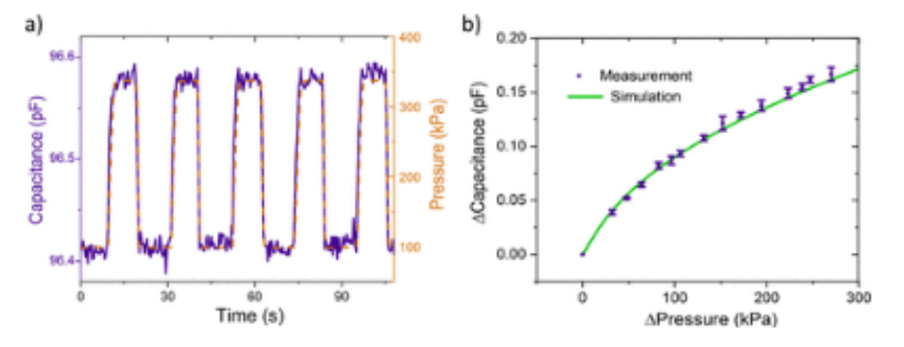 圖5. 電容–GPH電容式壓力傳感器的壓力響應。(a) 在340 kPa至大氣壓的五個壓力循環中,設備電容和外部壓力隨時間繪制。(b) 作為壓力變化函數的平均電容變化圖,將FvK FEM模擬與測量進行比較。誤差條是九個讀數的標準偏差。