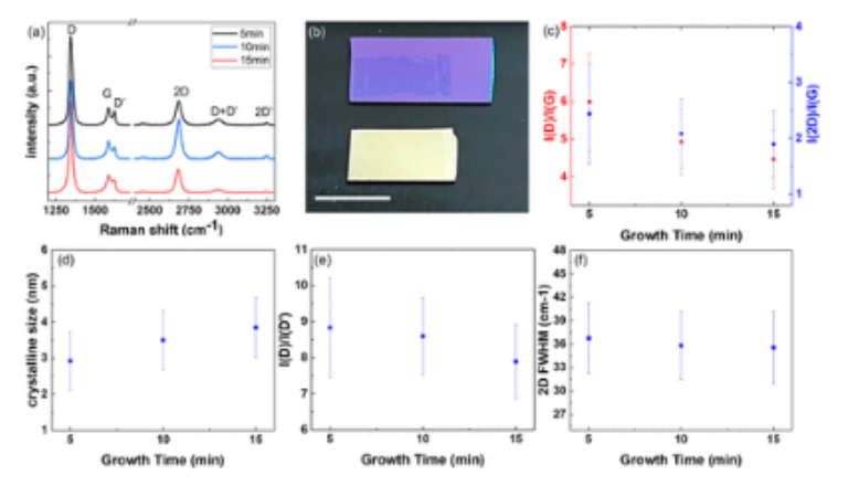 2靶襯底并排包括,以證明在移除石墨烯之前石墨烯在其上的完全覆蓋。比例尺為1cm。(c)不同生長時間的樣品的拉曼強度比I(D)/I(G)和I(2D)/I(G)。(d) 從I(d)/I(G)比率和方程式1中提取的不同樣品的石墨烯粒度。(e) 不同生長時間的樣品的I(D)/I(D′)比值和(f)不同生長時間樣品的2D峰的半峰全寬(fwhm)。