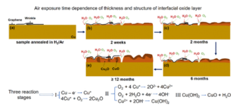 圖5. 石墨烯覆蓋的Cu的氧化和具有不同界面氧化程度的Gr/Cu樣品的界面氧化層的結構演變示意圖:(a)還原的Gr/Cu樣品;(b) 暴露于環境條件2周的Gr/Cu樣品;(c) 2個月;(d) 6個月;(e)≥12個月。