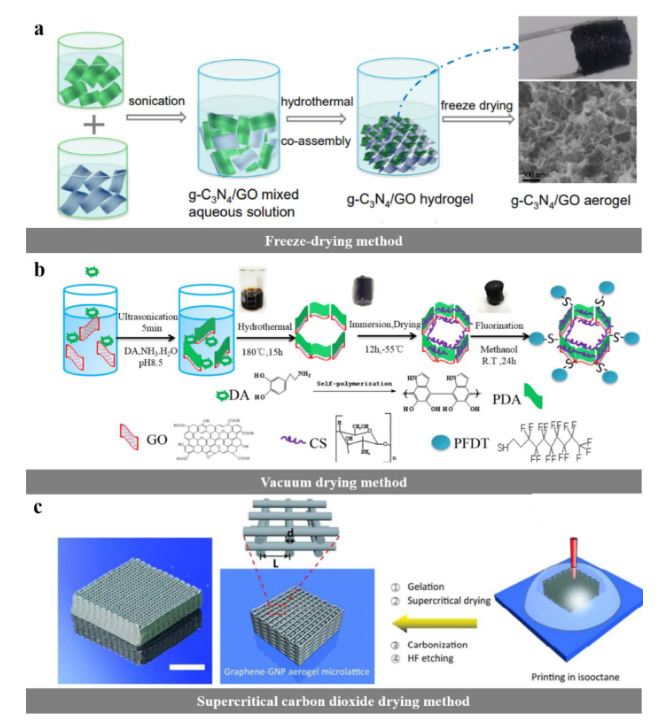 圖3. (a) Gr/CNT氣凝膠、(b) C -HPMC /rGO-x、(c) GO-COS和(d) C-AL/CNF-5多孔結(jié)構(gòu)的制備過程。