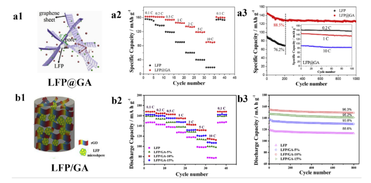 圖6.鋰離子電池中LFP@GA和LFP/GA的(a1, b1)理論模型,(a2, b2)倍率性能和(a3, b3)循環(huán)穩(wěn)定性 。