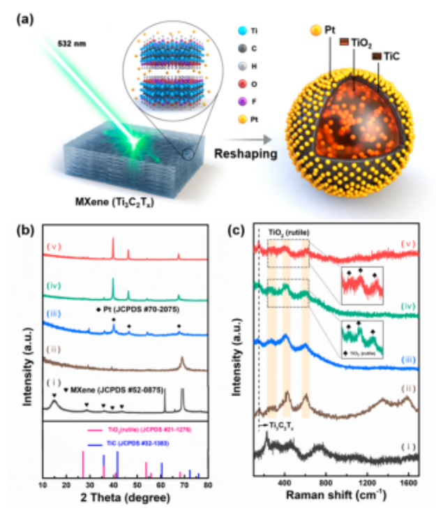 2@ TiC/Pt的原理圖設計。(b, c) XRD和拉曼光譜,分別為(i) MXene, (ii) TiO