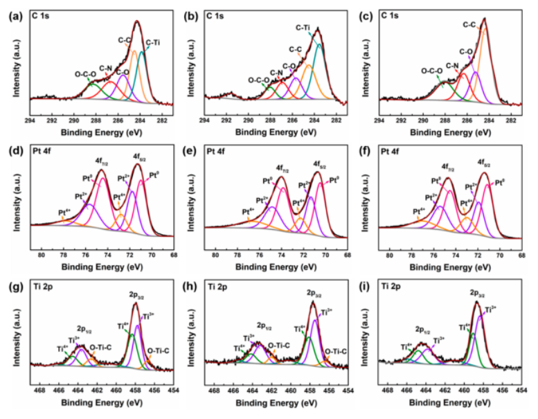 2@TiC/Pt-10和(右)Pt/TiO2@TiC/Pt-20樣品的(a−c) c 1s、(d−f) Pt 4f和(g−i) Ti 2p的XPS核心光譜。