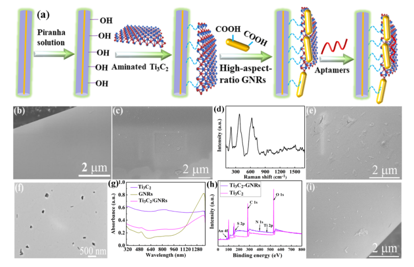 2-GNRs樣品的XPS測量光譜。(i)固定在制備好的微纖維表面上的CAIX適配子的SEM圖像。