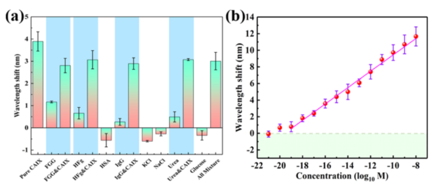圖4 (a)在所制備的傳感器響應時波長移位的比較. (b) 30%血清中CAIX蛋白濃度與波長位移的關系。
