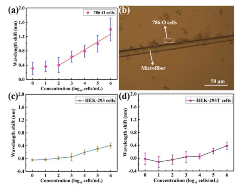 圖5 (a)波長位移與786-O細胞濃度范圍的關系圖. (b)所制備的捕捉目標786-O細胞的微纖維光學圖像. 波長位移相對于(c) HEK 293細胞和(d) HEK 293T細胞濃度的曲線。