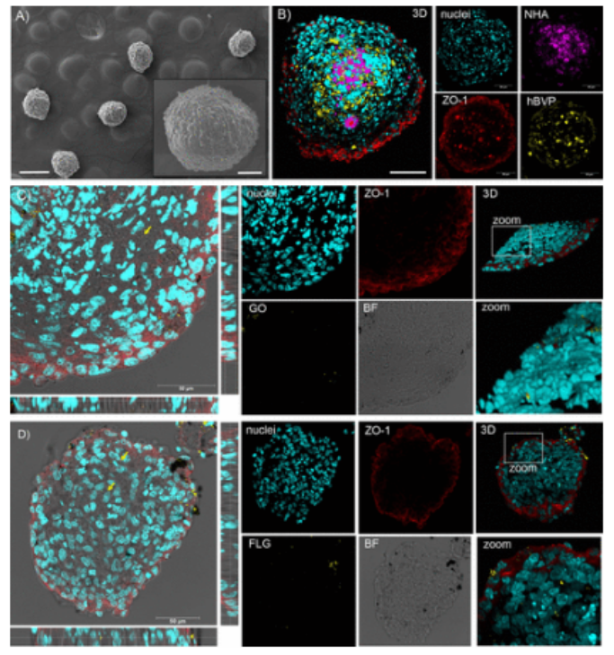由于石墨烯基材料(GRMs)的生物相容性和高運載能力,它可能代表了一種理想的大腦輸送系統。石墨烯基材料到達大腦的能力主要是在體內進行的調查,并突出了一些爭議。在此,我們采用了兩種復雜性不斷增加的體外BBB模型來研究與氧化石墨烯(GO)和幾層石墨烯(FLG)的仿生相互作用:二維小鼠Transwell模型,然后是三維人類多細胞集合體,以模仿體內結構的復雜性和細胞間的串擾。我們開發了特定的方法來評估GO和FLG在無標簽方式下的轉移,以及一個適用于任何納米材料的平臺。總的來說,我們的結果顯示這兩種GRM具有良好的生物相容性,不影響屏障的完整性和功能。充分分散的GO和FLG亞群被內皮細胞積極吸收;然而,這種轉移被認為是一種罕見的事件。