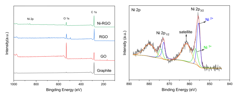圖3. 石墨、GO、RGO和Ni-RGO的XPS譜(a)測量譜;(b) Ni-RGO的Ni 2p高分辨率光譜。