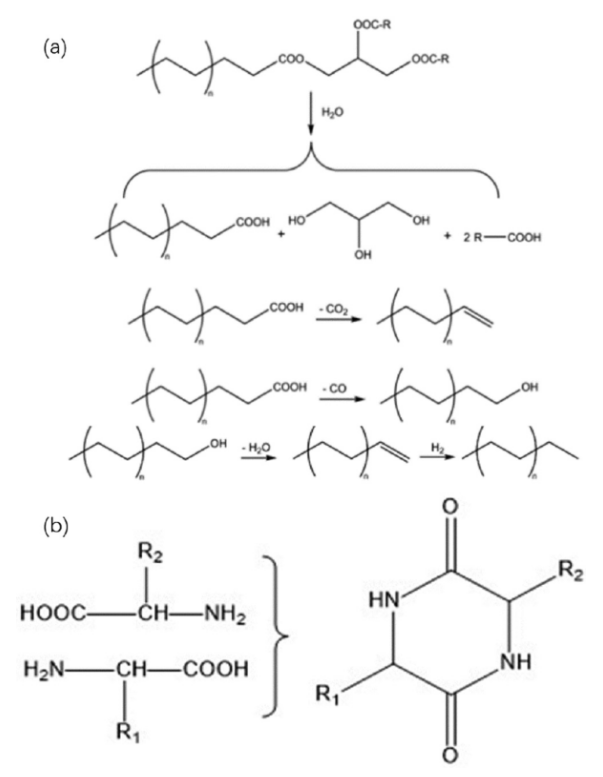 圖9. (a)脂質生成烴、(b)由氨基酸生成的2,5-二酮哌嗪的機理。