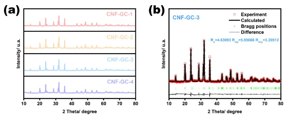 圖3. (a) CNF-GC-x的XRD圖譜。(b) CNF-GC-3的Rietveld細化XRD圖譜。