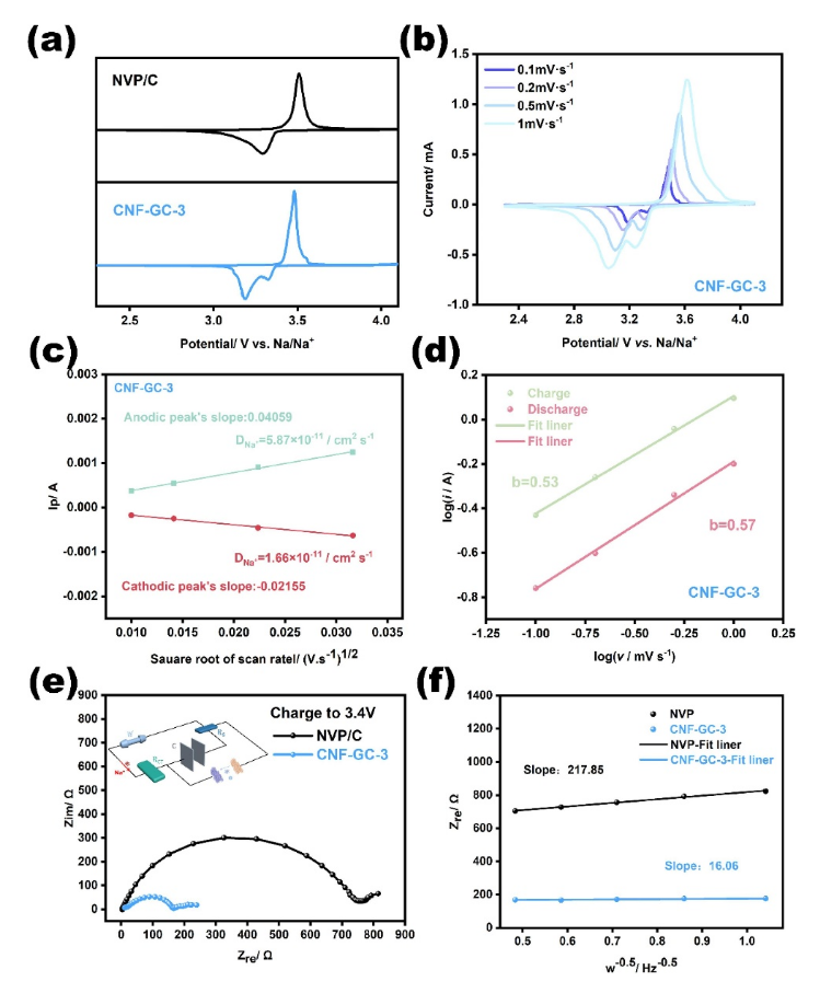 1/2曲線。(d) log v vs log i的線性擬合。(e)帶等效電路模型插入的兩電極帶電態Nyquist圖。(f) NVP/C與CNF-GC-3的 ' Z'-ω