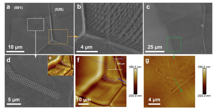 圖2. 在多晶銅箔上生長石墨烯的(a)-(d) SEM和(e)-(g) AFM圖像。