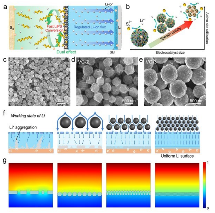 Fig 1. 示意圖說明了基于 VC 的隔膜對硫和鋰析出效率的規模效應。 (a) 基于 VC 的隔膜對硫和鋰析出的雙重影響。 (b) VC 球體與電化學活性之間的關系。 (c–e) 各種 VC 樣品的 SEM 圖像。 (f) VC 大小對鋰離子動力學行為的影響。 (g) 篩孔密度與鋰離子通量之間關系的 COMSOL 結果。
