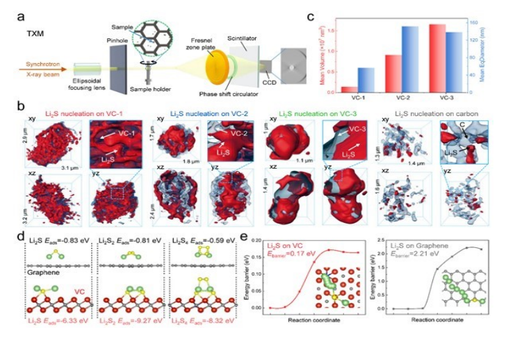 2S 的同步加速器 X 射線 3D 納米 CT 圖像。 (c) 來自同步加速器X射線3D納米 CT的VC上 Li2S 沉淀的平均質量比例和 eqdiameter。 (d) VC 和石墨烯對 Li