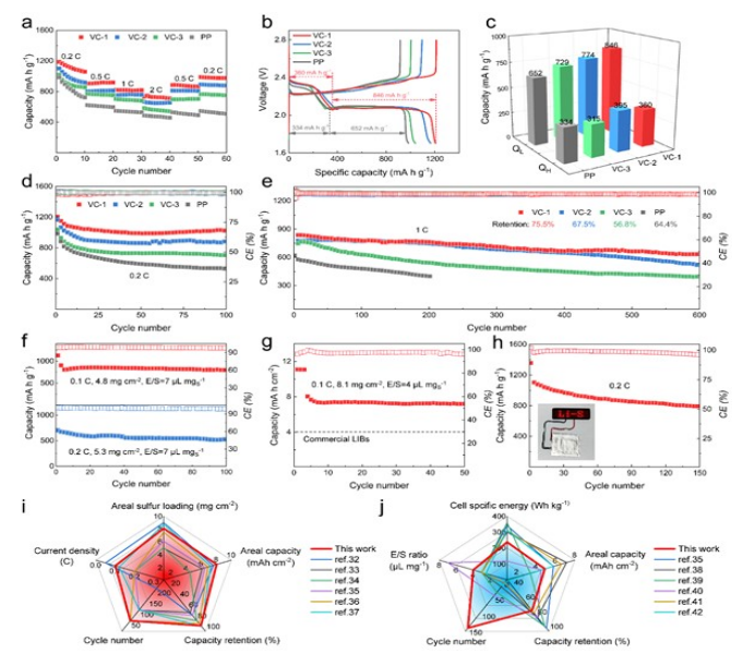 -2 的 Li-S 電池的循環性能。 (h) 插入 VC-1/PP 的 Li-S 軟包電池在 0.2 C 下的循環性能,插圖顯示了由串聯軟包電池點亮的 LED 器件。 (i–j) 雷達圖顯示了這項工作與其他報告之間的鋰硫電池性能比較。