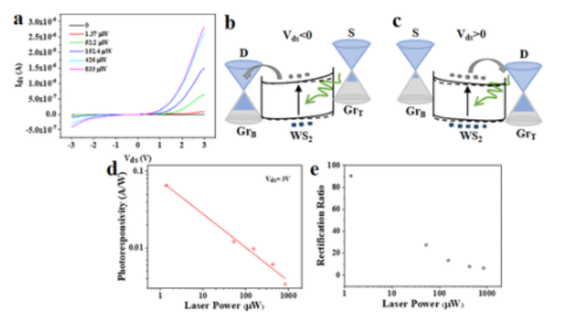 T器件顯示了整流行為。(b, c) 不對稱結構在負(b)和正(c)偏壓照明下的帶狀圖。灰色和藍色的點分別代表電子和空穴。灰色的箭頭表示電子的遷移。實線是在黑暗條件下,而虛線是在光照下。(d) (a)中3V源-漏極偏壓下反應率對激光功率的依賴性。(e) (a)中不同激光功率下V