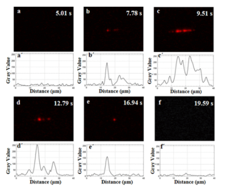 圖6. 結點區域的EL發射的時間依賴性。(a-f)光學圖像顯示了EL發射的演變和(a′-f′)其相應的強度線圖。它顯示了電致發光的開始,從一個點向一個條狀增長,從一個條狀向一個點減弱,最后逐漸消失。
