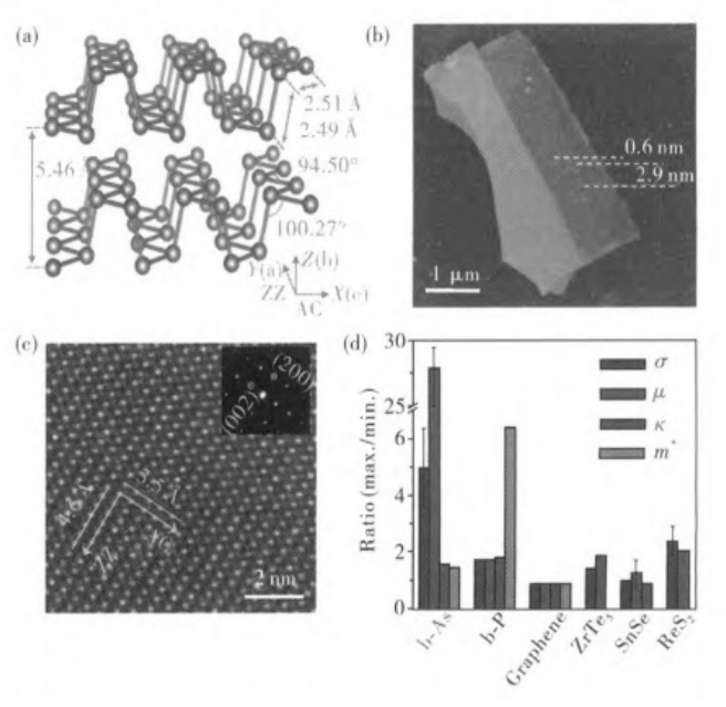 圖4. 層狀黑砷晶格與物性的各向異性:(a)用DFT計算的b—As結構晶格參數的三維表示;(b)機械剝落的b-As的AFM像;(C)具有原子分辨率的b—As的HRTEM圖像;(d)沿b-As和其他二維材料的Ac和zz方向的電導率σ、遷移率μ、熱導率K和有效質量m‘的平面內各向異性的比較。