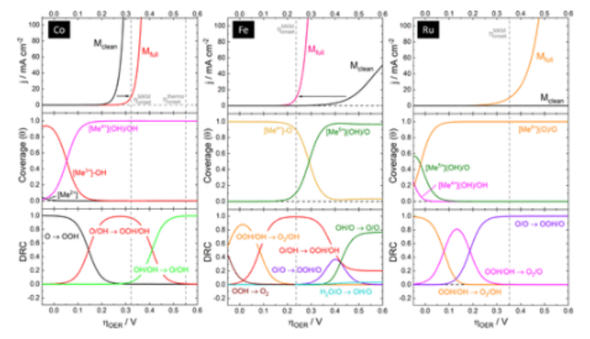 full得出的。對于鐵和釕,純熱力學預測估計過電位大于1.0V(表1)。每種金屬只有相關狀態的覆蓋率曲線顯示在各自的面板上。通過清潔機制的Ru的電流密度被預測為不活躍,因為它受到O