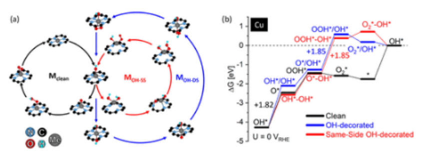 OH-DS)反應機制和(b)相應的自由能圖,在U=0 V
