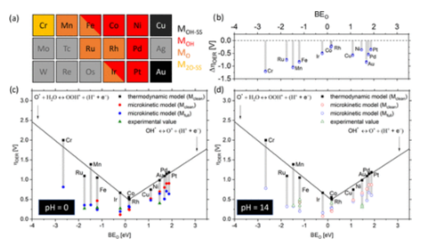 onsetthermo):負值對應于微觀動力學分析導致的過電位下降。在pH值為(c)0和(d)14的情況下,單原子過渡金屬支持在N摻雜的石墨烯(M