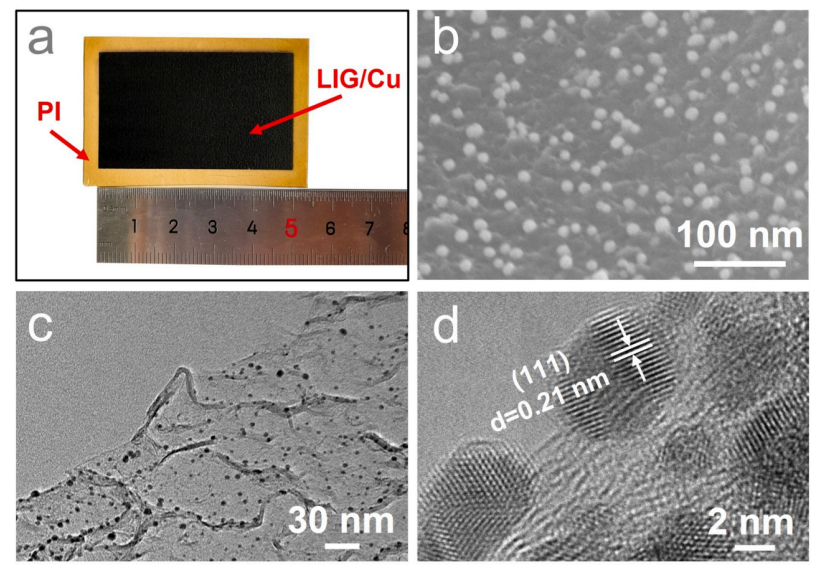 圖3. (a) LIG/Cu的光學照片。(b) LIG/Cu的SEM俯視圖。(c) LIG/Cu的TEM圖像。(d) LIG/Cu的高分辨率TEM圖像。