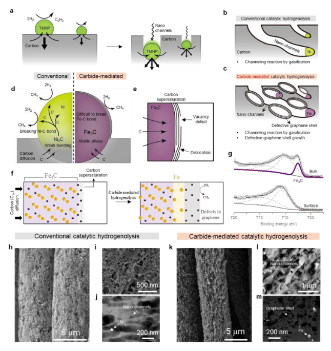 2 氣氛下 TM 催化的碳氫解反應示意圖。 (b-c) 傳統 (b) 和碳化物介導 (c) 催化氫化后碳表面的示意圖。 (d-f) 作為一種過渡金屬催化劑的常規和碳化物介導的氫解的詳細反應途徑 (d) 和石墨烯殼在 Fe