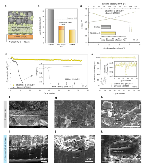 -2 的各種陽極電極的估計厚度。 (c) GR|CM–hy–C || 的第一個循環電壓曲線NCM811和鋰|| NCM811。 (d 和 e) GR|CM–hy–C || 的循環性能 (d) 和庫侖效率 (e) NCM811和鋰|| NCM811。所有測試均在充電和放電過程中以 0.3 C 倍率的電流密度進行。 (f-h) 循環后鋰的橫截面 SEM 圖像 || NCM811。 (i-k) 循環后 GR|CM–hy–C || 的橫截面 SEM 圖像NCM811。