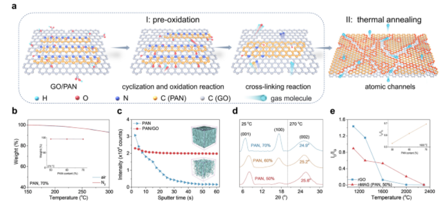 Fig 2. 基于PAN原子氣體溢出通道。a GO/PAN中原子通道形成的示意圖;b GO/PAN在N2和空氣氣氛中的TGA圖 (PAN, 70%),插圖顯示了不同PAN含量的nMAG在N2和空氣中加熱到270℃的剩余質;c 600 nm厚預氧化GO/PAN 膜 (PAN, 70%)和PAN 膜中氧元素的飛行質樸圖及其對應的氧三維映射圖(插圖);d 270℃預氧化前后不同PAN含量GO/PAN薄膜的XRD譜圖;e不同溫度下熱處理nMAG (PAN, 50%)和還原氧化石墨烯的ID/IG值。右上顯示了不同PAN含量下1600℃處理的nMAG的ID/IG值。