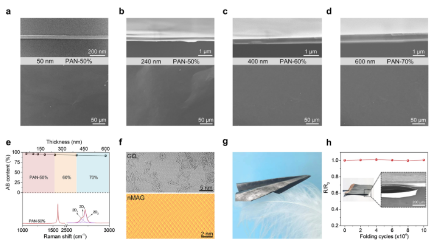 Fig 3. nMAG 的結構和靈活性。a 50 nm 厚 nMAG 的 HR-TEM(橫截面,上)和 SEM(表面,下)圖像。b–d不同厚度的 nMAG 的橫截面和表面 SEM 圖像。e不同厚度的 nMAG 的 AB 含量(上)和 50 nm 厚的 nMAG 的拉曼光譜(下)。f GO 的 HR-TEM 圖像(上)和 nMAG 的 STM 形貌圖像(下)。g用 600 nm 厚的 nMAG 折疊的紙飛機。h重復折疊后 600 nm 厚的 nMAG 的電阻變化。
