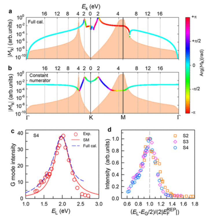 k處的聯合狀態密度值。(c) 實驗 REP(空心圓)和理論 REP 由從頭計算(完整計算,虛線)和 SM(實線)。(d) 作為 ( E