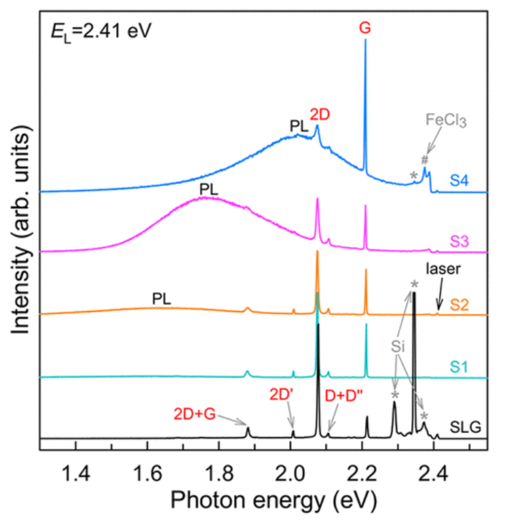 L =2.41 eV。石墨烯的拉曼峰以及來自 FeCl3和 Si 基板的拉曼峰分別由灰色 # 和 * 標記。樣品 S2–S4 中的寬帶背景是 2|E