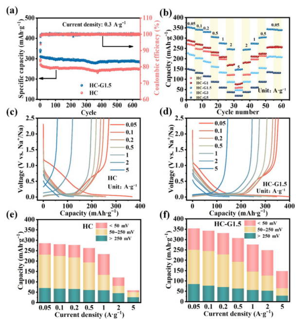Fig 4. (a)HC和HC-G1.5在1 C下的循環曲線。(b)不同樣品的倍率性能對比。(c,d)HC和HC-G1.5在不同電流密度下的充放電曲線。(e,f)不同電流密度下HC和HC-G1.5在各電位區間下的容量分布。