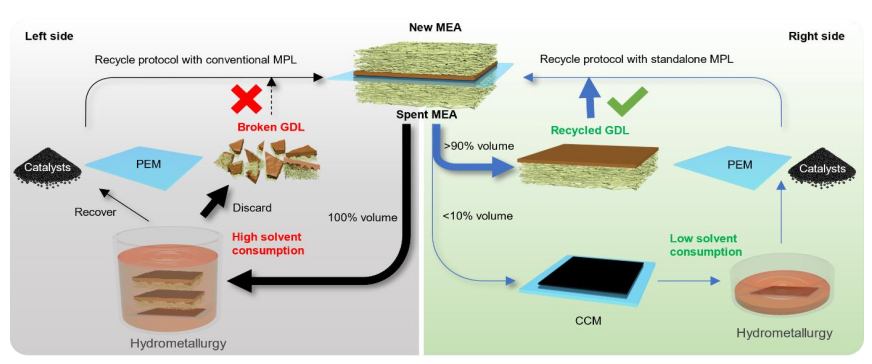 Fig 1. 使用常規 MPL 和我們的獨立 MPL 的廢 MEA 回收方案。 (左側)常規 MPL 的回收方案:GDLs 參與催化劑和 PEM 的回收,不僅導致大量溶劑的消耗,而且難以重復使用 GDLs 進行結構破壞。 (右側)獨立 MPL 的回收方案:GDL 不參與催化劑和 PEM 的回收,這不僅顯著減少了溶劑消耗(不到傳統 MPL 的 10%),而且還可以回收和再利用 GDL。