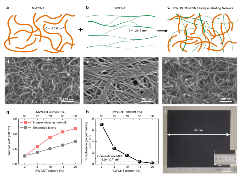 Fig 2. 獨立 MPL 的結構和物理特性。 (a) MWCNT 松散網絡、(b) SWCNT 交聯網絡和 (c) SWCNT/MWCNT 互穿網絡的方案。 (d) MWCNT 松散網絡、(e) SWCNT 交聯網絡和 (e) SWCNT/MWCNT 互穿網絡的 SEM 圖像。 (g) 獨立 MPL 的實力SWCNT 和 MWCNT 含量的變化(含 20% PTFE)。 (h) 隨著 SWCNT 和 MWCNT 含量的變化(含 20% PTFE),獨立 MPL 的平面透氣率。 (i) 45×45 cm2 (2025 cm2) 的大型獨立 MPL 的光學圖像。
