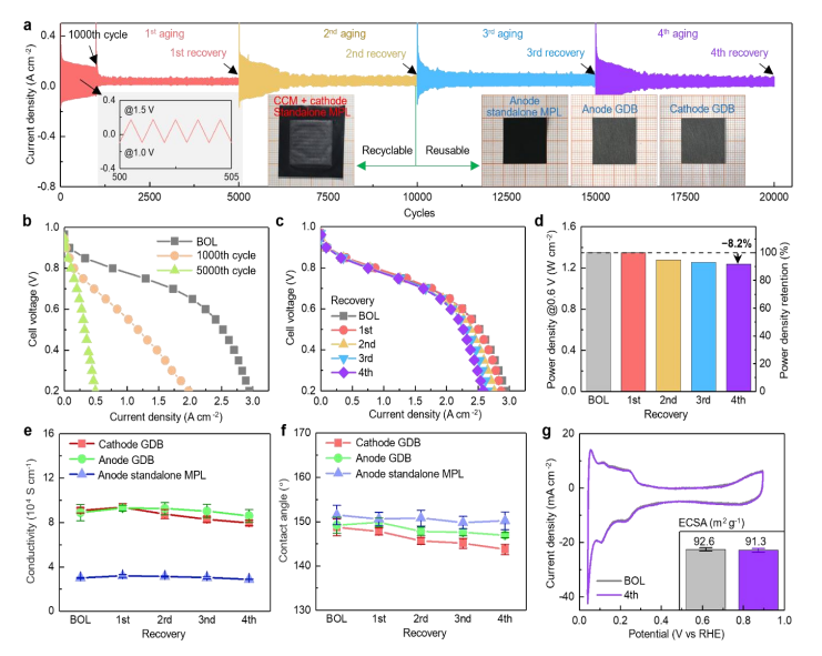 Fig 5. GDL 的可重用性。 (a) 加速壓力測試和 MEA 恢復。壽命終止的CCM 和陰極獨立 MPL 被原始 CCM 和陰極獨立 MPL 取代,而陰極 GDB、陽極獨立 MPL 和陽極 GDB 被重復使用。 (b) 燃料電池在壽命開始 (BOL)、第 1000 次循環和第 5000 次循環時的性能。燃料電池在 80ºC、200 kPaabs 氣壓和 60 RH% 的陽極和陰極條件下進行了測試。 H2 和空氣的氣體流速分別為 125 sccm 和 500 sccm。 (c) BOL 的燃料電池性能和每次回收。 (d) 0.6 V BOL 和每次恢復時的功率密度。 (e) 重復使用的組件的導電性。 (f) 重復使用部件的水接觸角。 (g) BOL 和第 4 次回收后燃料電池的 ECSA。