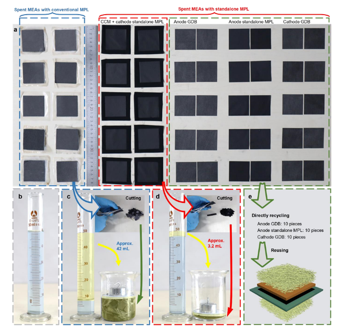 Fig 6. 回收不同的廢 MEA。 (a) 帶有傳統 MPL 的廢 MEA 和帶有獨立 MPL 的廢 MEA 的光學圖像。 (b) 裝有 50 mL 溶劑的量筒。 (c) 使用傳統 MPL 回收 MEA 的溶劑消耗。 (d) (f) 使用獨立 MPL 回收 MEA 的溶劑消耗。 (e) 陽極 GDB、陽極獨立 MPL 和陰極 GDB 的直接回收和再利用。
