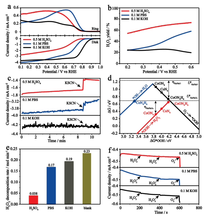 2在CB@Co-N-C存在下的分解速率。(f)0.4 V下,CB@Co-N-C在三種電解液中引入H