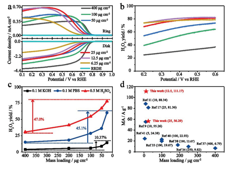 2產(chǎn)量依賴于電解質(zhì)的pH值和催化劑負(fù)載。在催化劑負(fù)載量低的酸性介質(zhì)中,CB@Co-N-C 表現(xiàn)出優(yōu)異的質(zhì)量活性和對 H
