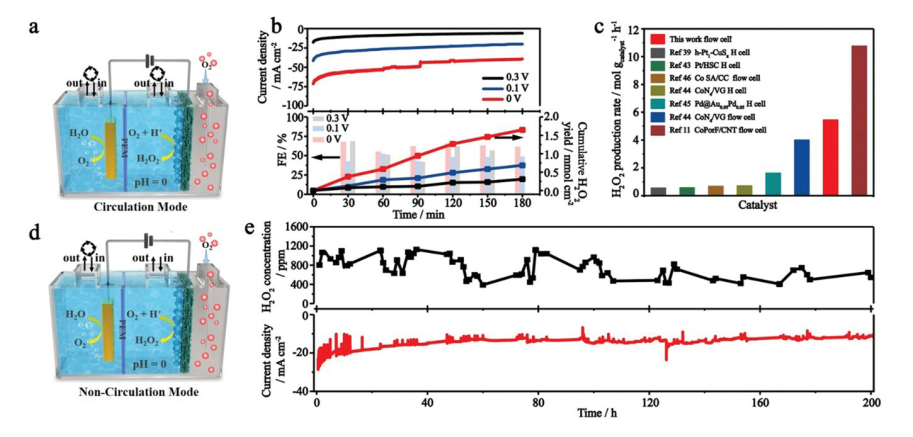 2產(chǎn)率比較(at 0 V)。(d)電解質(zhì)非循環(huán)模式下的流動池示意圖。(e)電解液非循環(huán)模式下,CB@Co-N-C在流動池上的電流密度和H