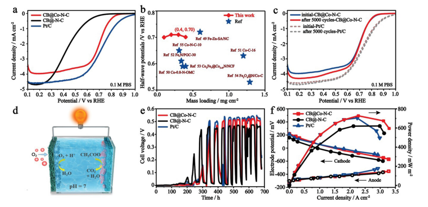 2。(b)中性介質(zhì)中,CB@Co-N-C和文獻(xiàn)中報(bào)道的其它催化劑的半波電位比較。(c)在0.6-1.1 V,掃速為100 mV/s時(shí),CB@Co-N-C和Pt/C在5000圈循環(huán)前后的穩(wěn)定性比較。(d)MFC示意圖。CB@Co-N-C、CB@N-C和Pt/C分別作為陰極電催化劑,組裝MFC的(e)電壓輸出曲線和(f)功率密度曲線和電極電勢。