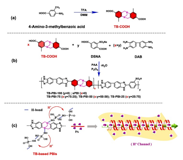 Fig 1. (a)二羧酸單體(TB-COOH) 和 (b) 基于 TB 的 PBI(TB–PBI-100、TB–PBI-75、TB–PBI-50、TB–PBI-25)和 sPBI 的合成;(c) 基于 TB 的 PBI 的質(zhì)子轉(zhuǎn)移機(jī)制。
