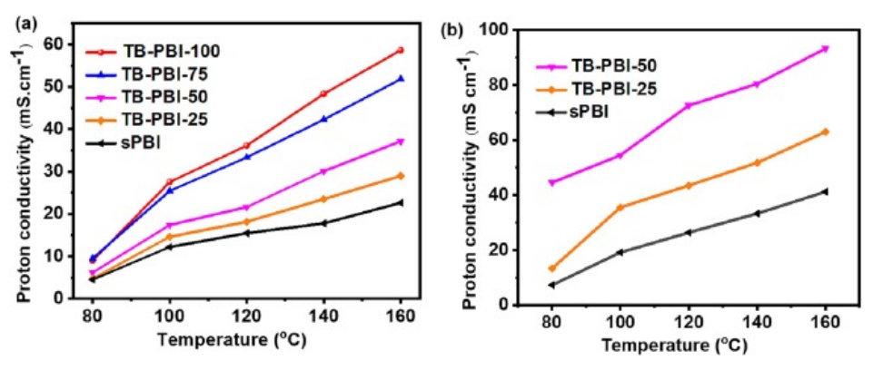 Fig 6. (a) TB–PBI-100、TB–PBI-75、TB–PBI-50、TB–PBI-25 和 sPBI 膜摻雜 65 wt% 后,PA 摻雜膜的質(zhì)子電導(dǎo)率隨溫度的變化PA溶液以及 (b) TB–PBI-50、TB–PBI-25 和 sPBI 膜在摻雜 75 wt% PA 溶液后。