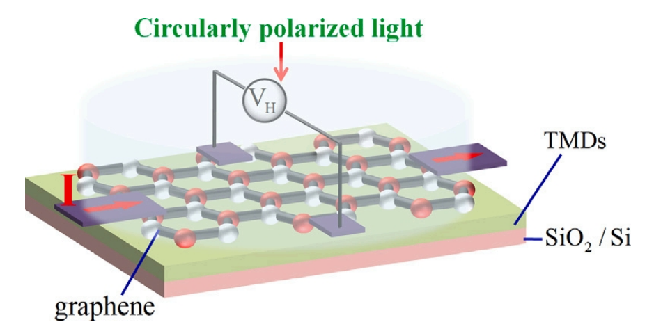 圖1. 圓偏振光照射Kekulé-O石墨烯的示意圖,其中紅色箭頭表示縱向電流,橫向測量的異常霍爾電流可以被光切換。