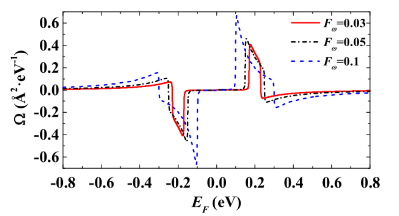 圖3. 不同光照參數(shù)Fω下,Berry曲率Ω(EF)與費米能量EF的關系,其中紅色實線、黑色點劃線和藍色虛線分別對應于Fω= 0.03 eV、0.05 eV和0.1 eV。