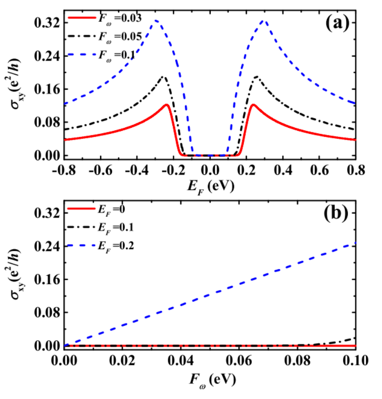 圖4. (a)不同光照參數(shù)Fω下異常霍爾電導率σxyEF的關系;(b)不同EFσxyFω的關系。