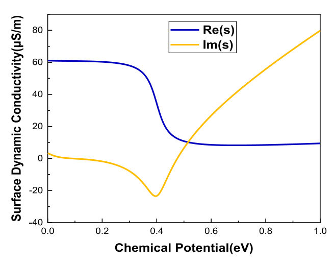 圖2. 單層石墨烯的表面動態電導率與其化學勢的關系。