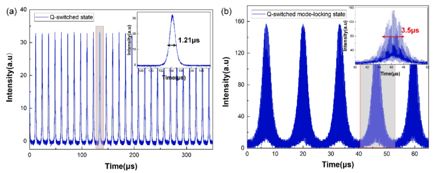 圖8. (a)使用P-GSHW的激光腔調q脈沖的時域序列。插圖顯示了單個脈沖的波形。(b)調q鎖模脈沖。插圖顯示了單個調q鎖模脈沖包絡的細節。